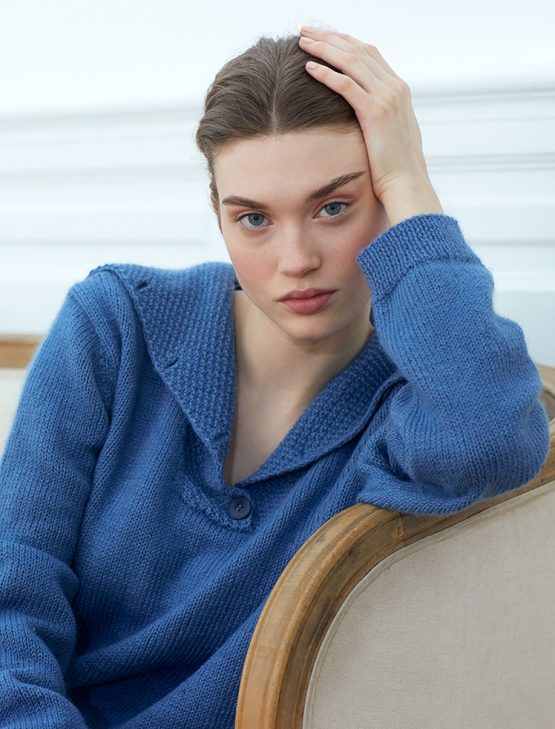 Material: Fidele (50% Bomull, 50% Ull) Storlek: 34/36 (38/40) 42/44 (46/48) 50/52 Stickor: 3 – 3,5 mm Maskhållare Materialåtgång: 10(11) 12 (13) 14 nystan av färg 14. 5 knappar med dia 20 mm