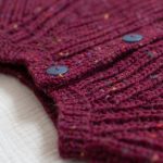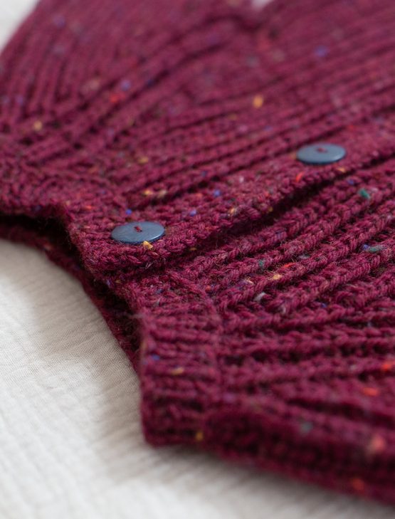 Material: Seraphine(50 % Ull, 39% Akryl, 11% Viskos) Storlek: 3 mån (6 mån) 12 mån (18-24 mån) 4 år Stickor: 3 – 3,5 mm Materialåtgång: 3 (4) 5 (6) 7 nystan av färg 62 maskhållare 4 (4) 5 (5) 6 knappar