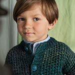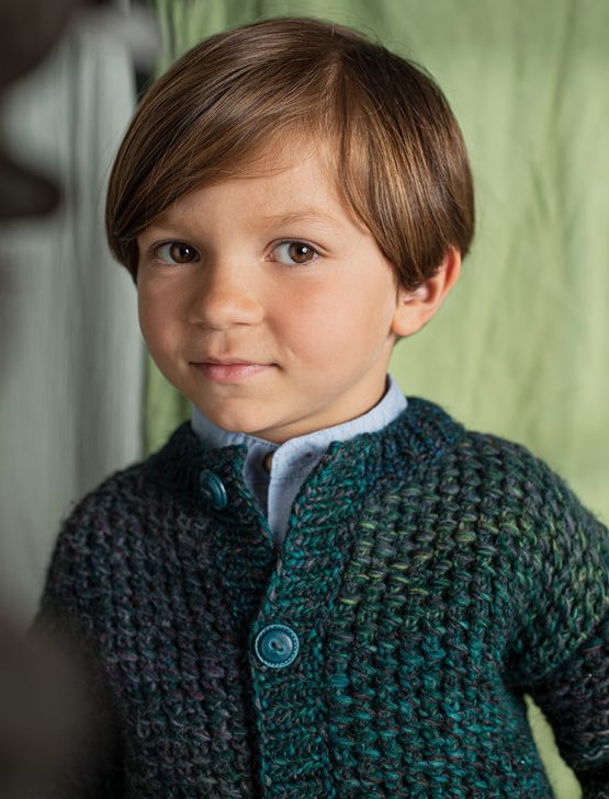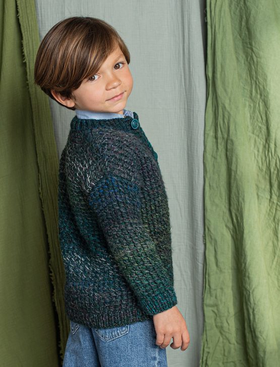 Material: Audace (30 % Ull, 70% Akryl) Storlek: 2 (4) 6-8 (10) 12-14 år Stickor: 4,5 – 5 mm markörer Materialåtgång: 1 (1) 2 (2) 2 nystan av färg 76 5 (5) 5 (6) 6 knappar med dia 22mm