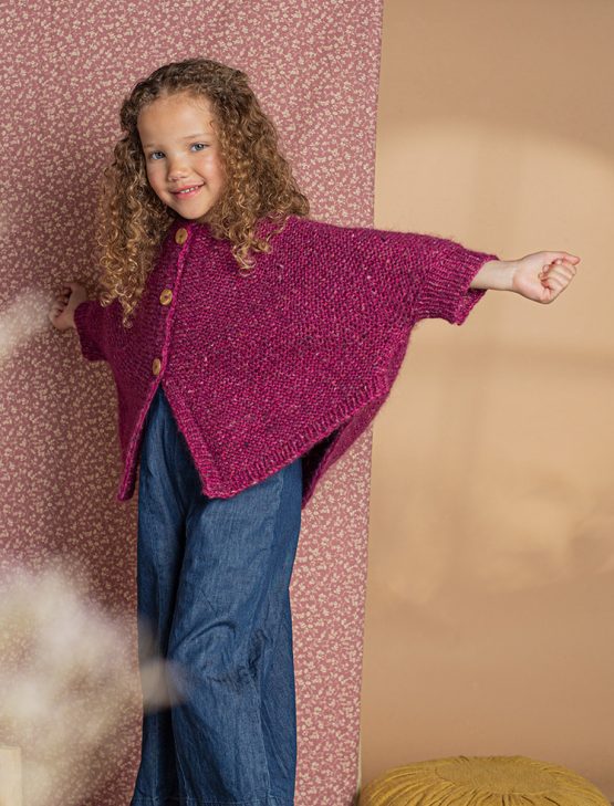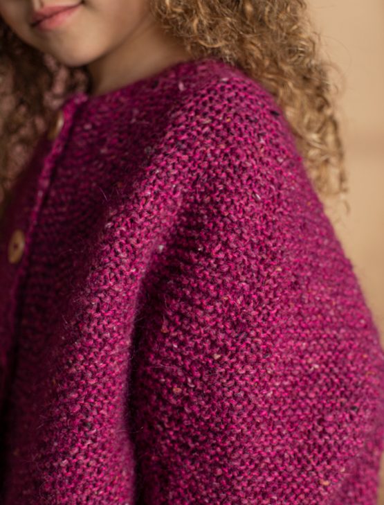 Material: Fantasque (20% Alpacka, 20% Ull, 56% Bomull, 4% Polyester) Storlek: 2 (4) 6-8 (10) 12-14 år Rundsticka: 4,5 mm Strumpstickor: 4,5 mm Materialåtgång: 3 (4) 5 (6) 7 nystan av färg 34 3 knappar med dia 22 mm