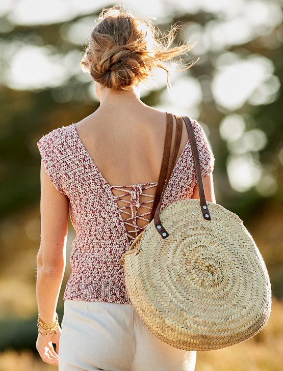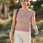 Material: Bergamote (90% Bomull, 10 % Polyester) Storlek: 34/36 (38/40) 42/44 (46/48) 50/52 Virknål: 4-5 mm Materialåtgång: 6 (7) 8 (9) 10 nystan av färg 63 markörer, synål